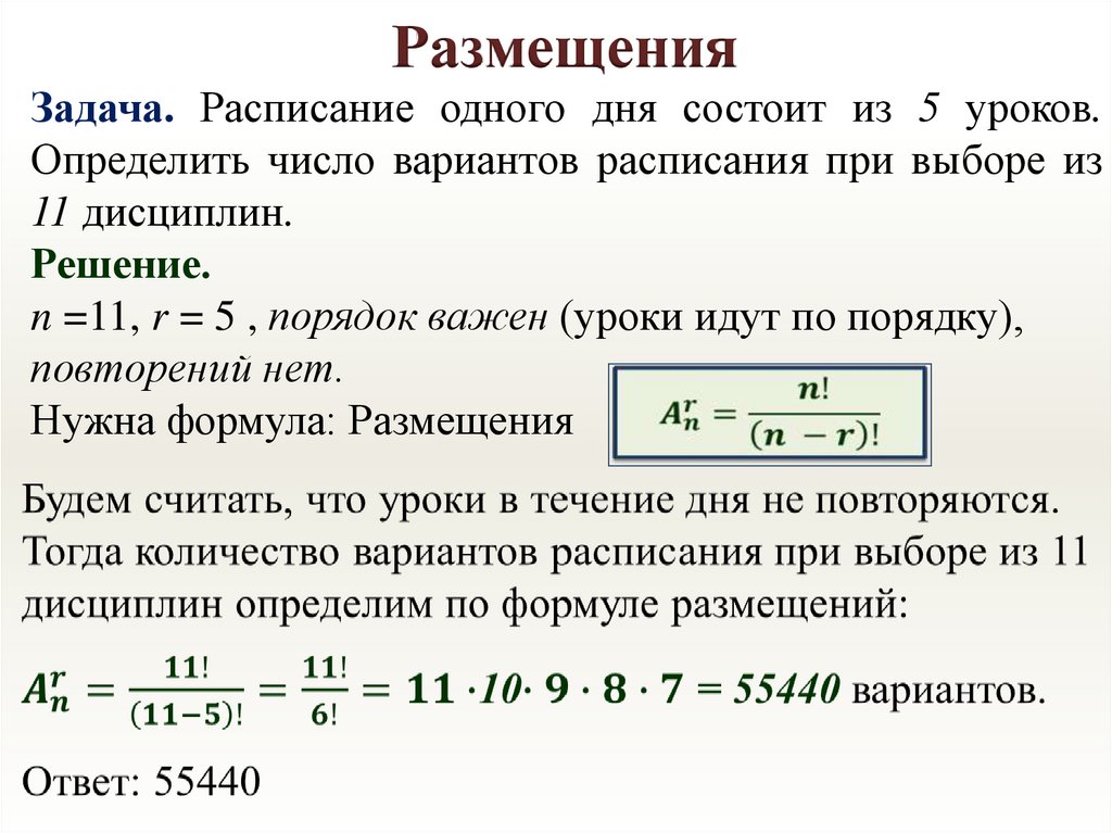 n =11, r = 5 , порядок важен (уроки идут по порядку),