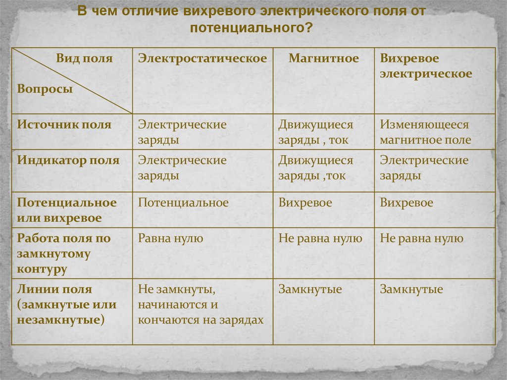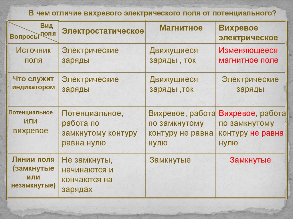 В чем отличие вихревого электрического поля от потенциального?Вид