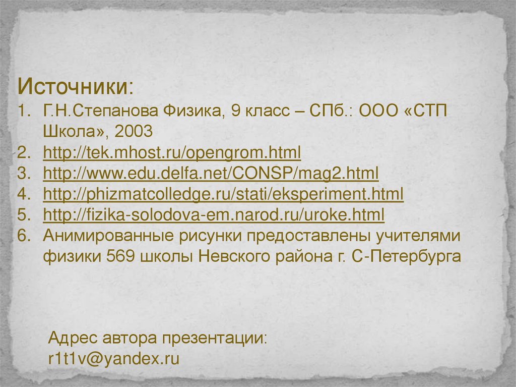Источники:1. Г.Н.Степанова Физика, 9 класс – СПб.: ООО «СТП