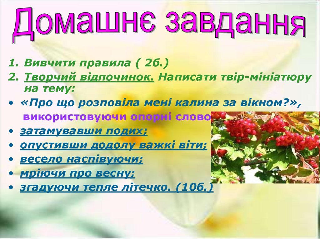 1. Вивчити правила ( 2б.)2. Творчий відпочинок. Написати твір-мініатюру