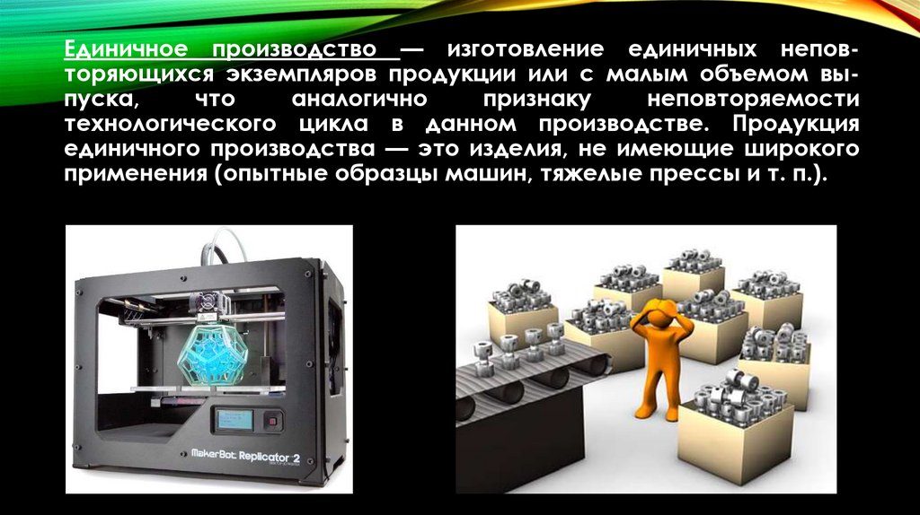 Единичное производство — изготовление единичных неповторяющихся экземпляров продукции или с малым объемом выпуска,что
