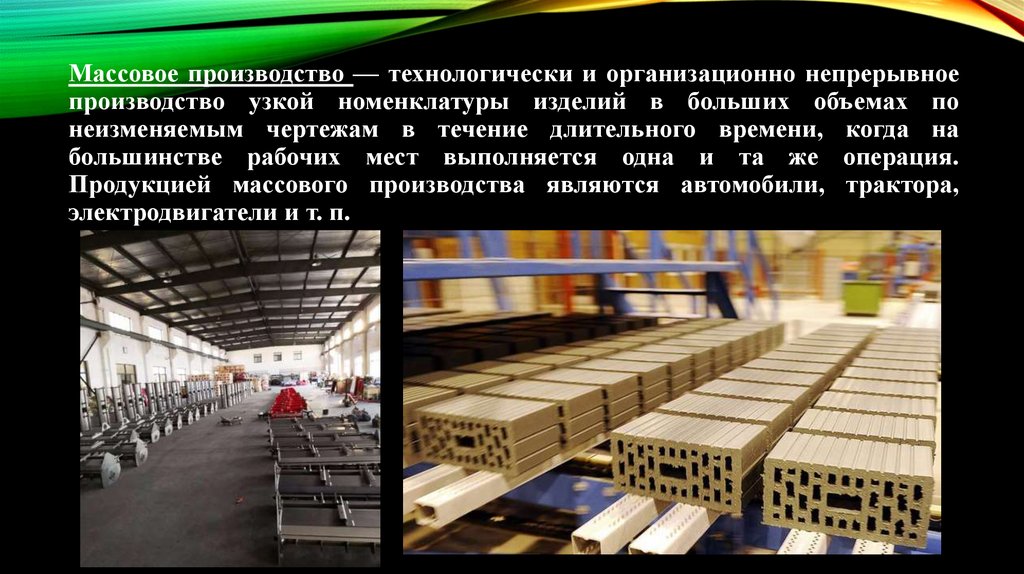 Массовое производство — технологически и организационно непрерывноепроизводство узкой номенклатуры изделий в больших объемах по