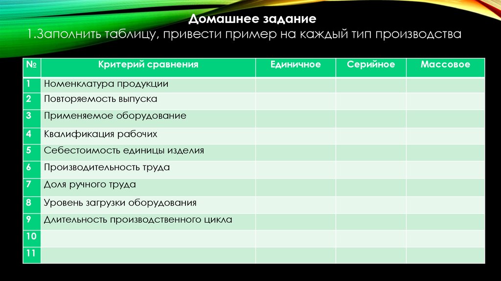 Домашнее задание1.Заполнить таблицу, привести пример на каждый тип производства