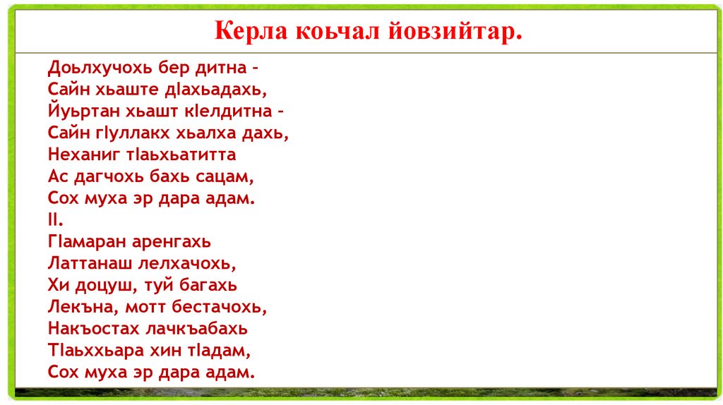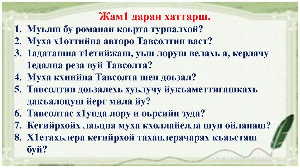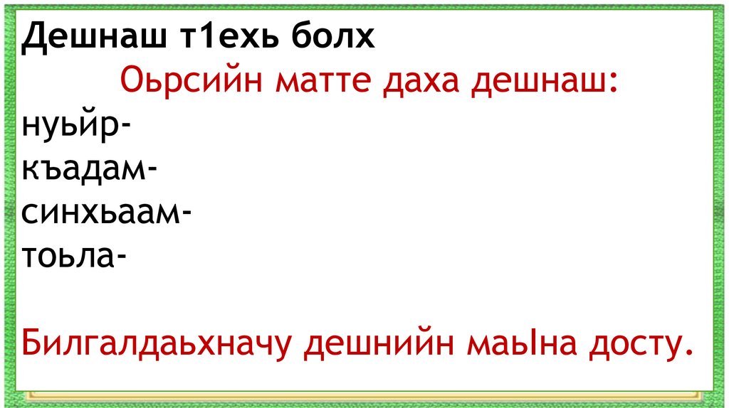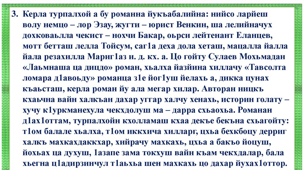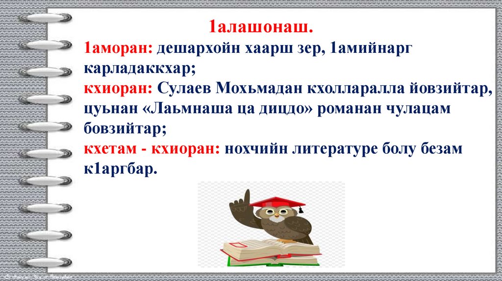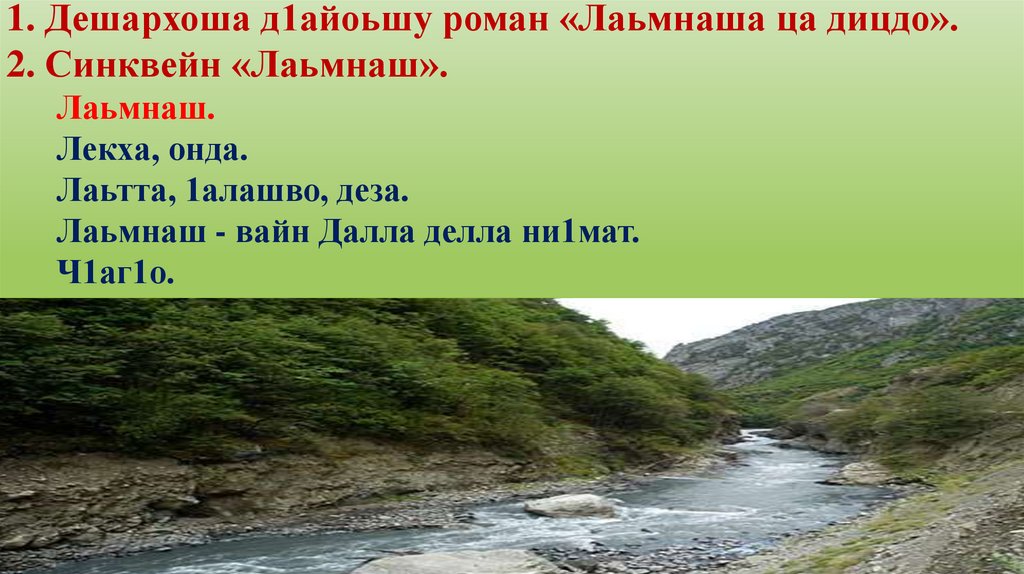 1. Дешархоша д1айоьшу роман «Лаьмнаша ца дицдо».2. Синквейн «Лаьмнаш».