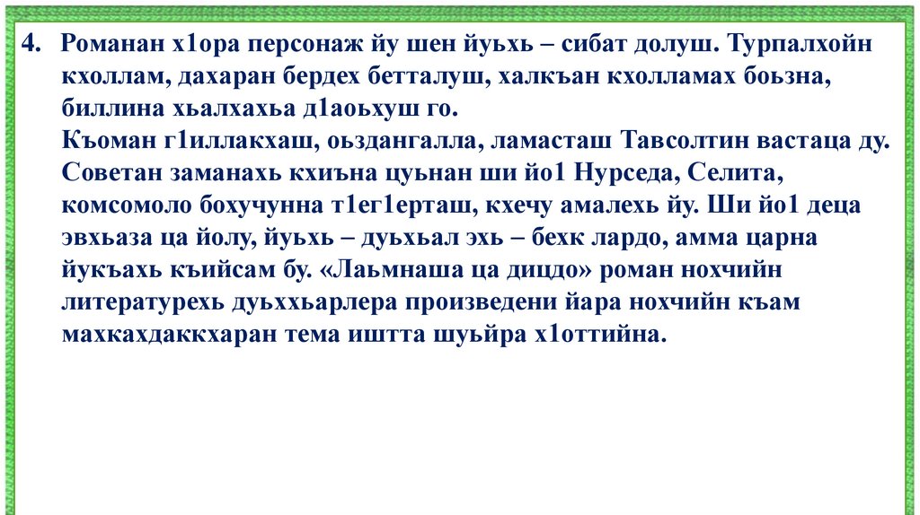 4. Романан х1ора персонаж йу шен йуьхь – сибат долуш. Турпалхойнкхоллам, дахаран бердех бетталуш, халкъан кхолламах боьзна,