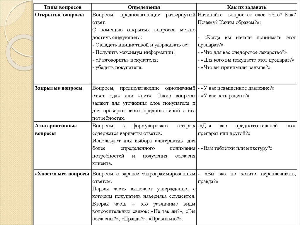 покупателя с помощью вопросов.