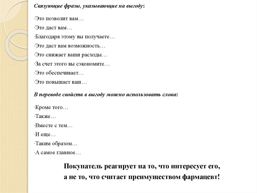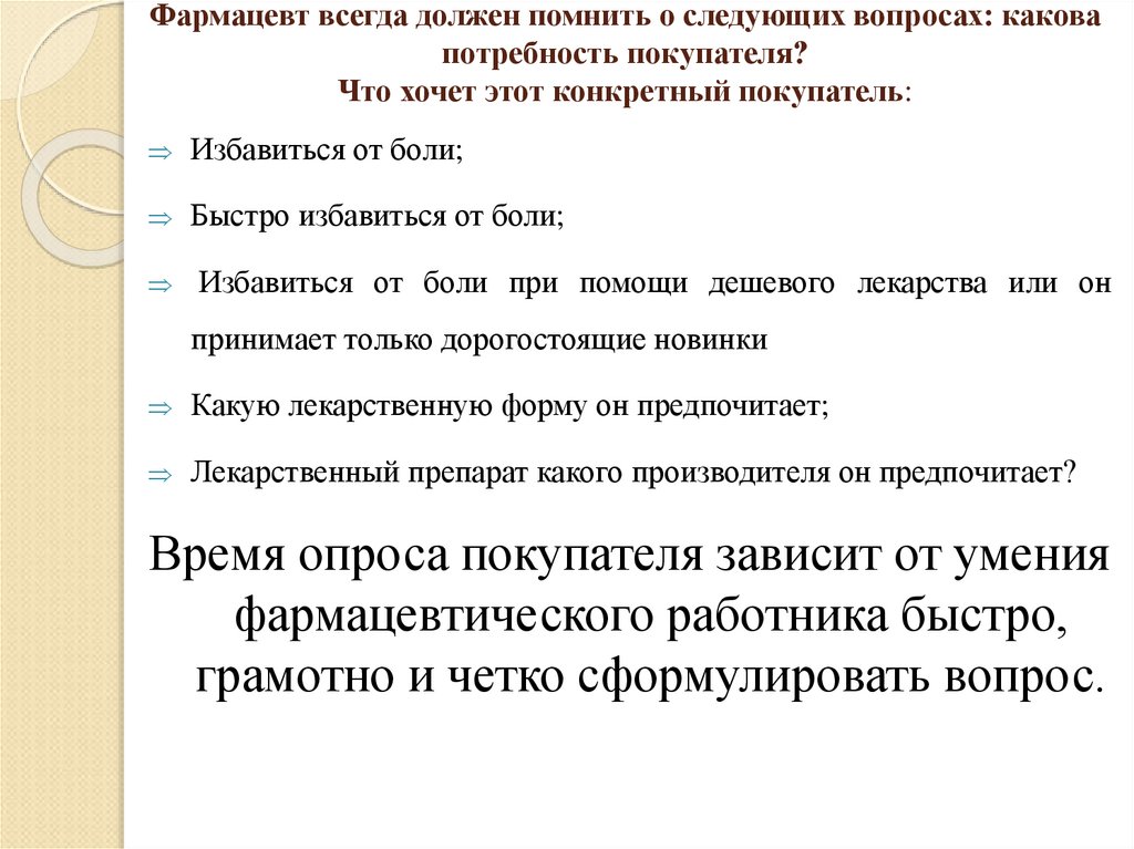10. Фармацевт всегда должен помнить о следующих вопросах: какова потребность покупателя? Что хочет этот конкретный покупатель: