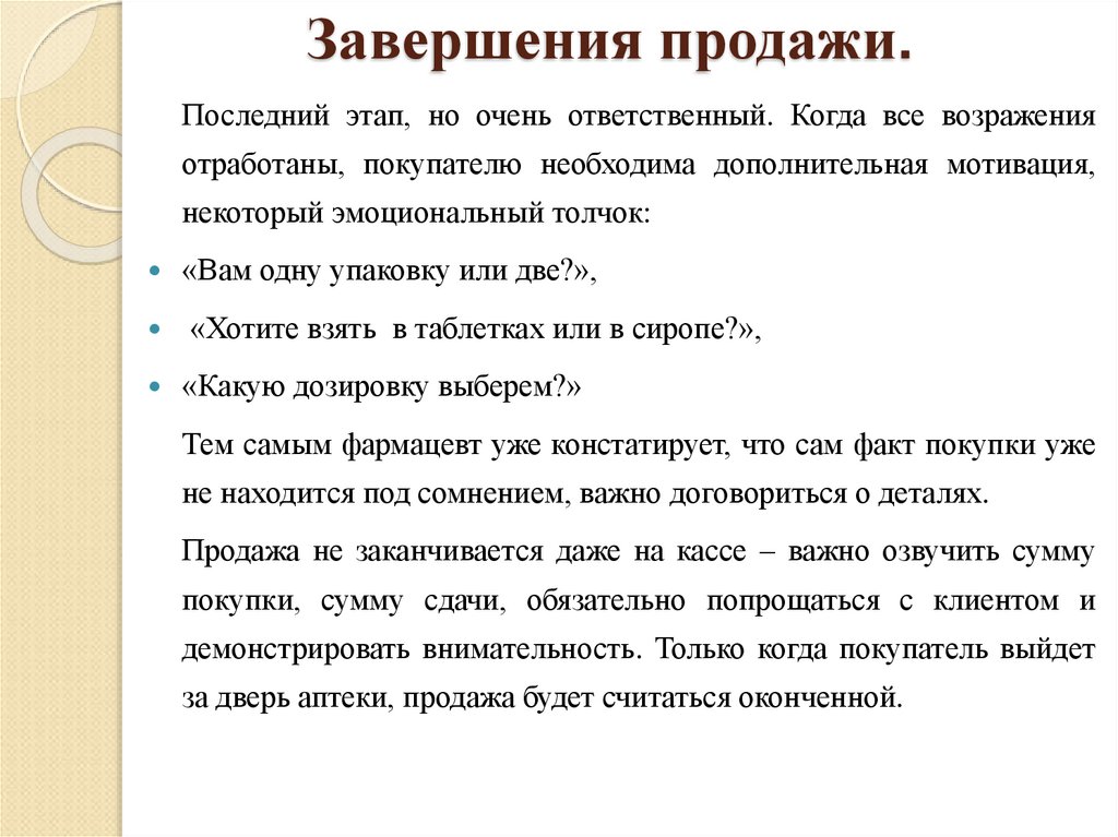 Последний этап, но очень ответственный. Когда все возраженияотработаны, покупателю необходима дополнительная мотивация,