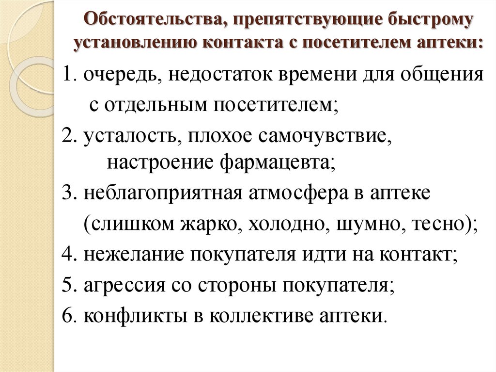 7. Обстоятельства, препятствующие быстрому установлению контакта с посетителем аптеки:
