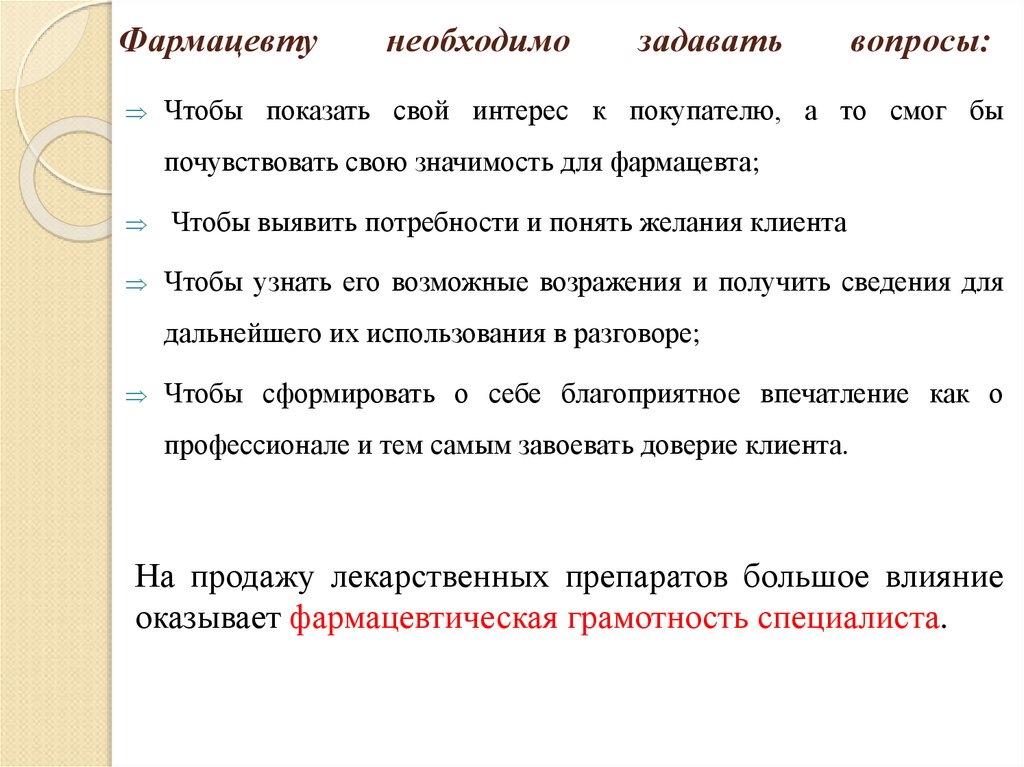 9. Фармацевту необходимо задавать вопросы: