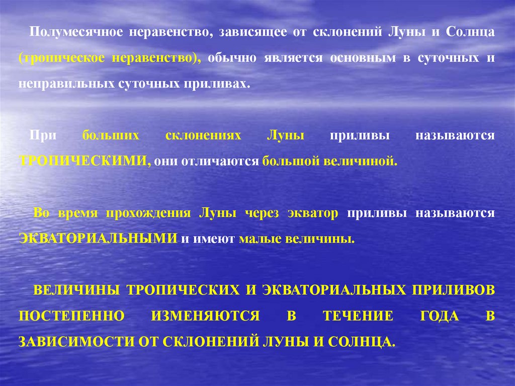 По мере увеличения склонения Луны нарастают суточные неравенстваи высотах смежных полных и смежных малых вод: от суток к суткам