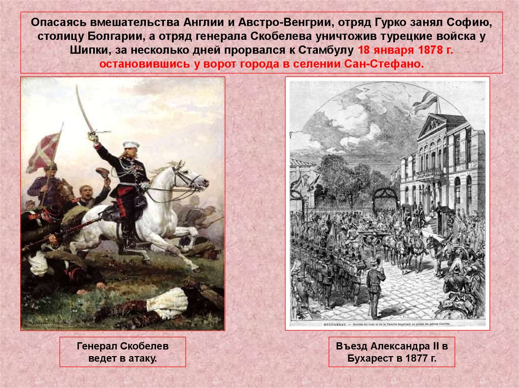 Опасаясь вмешательства Англии и Австро-Венгрии, отряд Гурко занял Софию,столицу Болгарии, а отряд генерала Скобелева уничтожив турецкие войска у