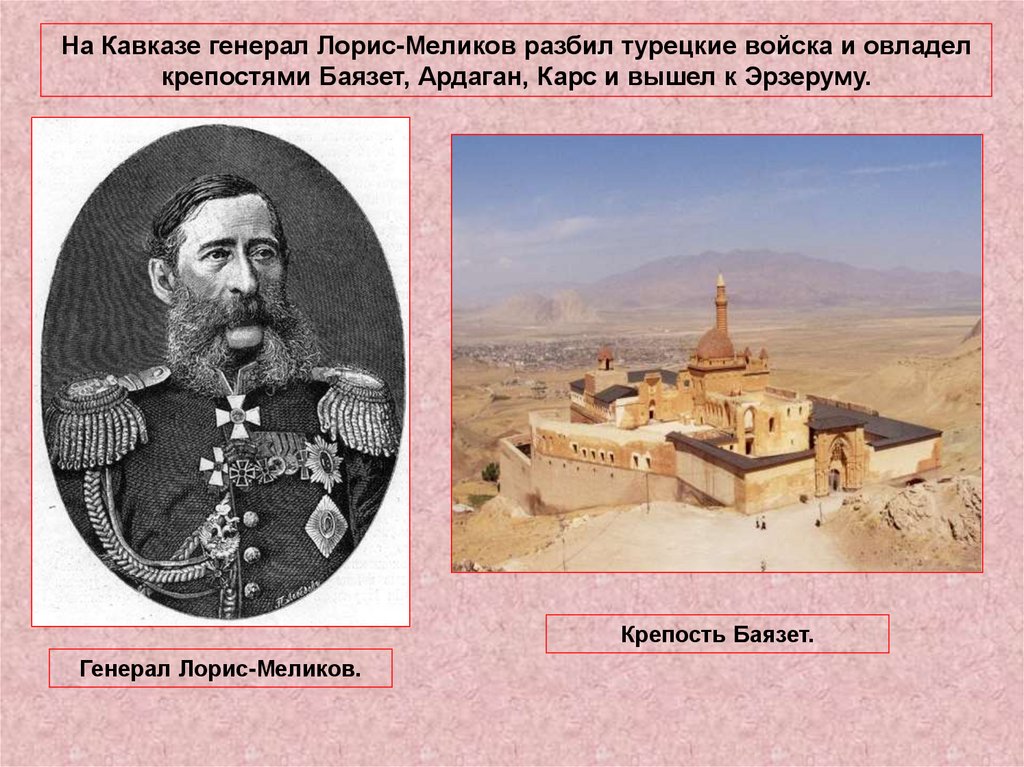 На Кавказе генерал Лорис-Меликов разбил турецкие войска и овладелкрепостями Баязет, Ардаган, Карс и вышел к Эрзеруму.