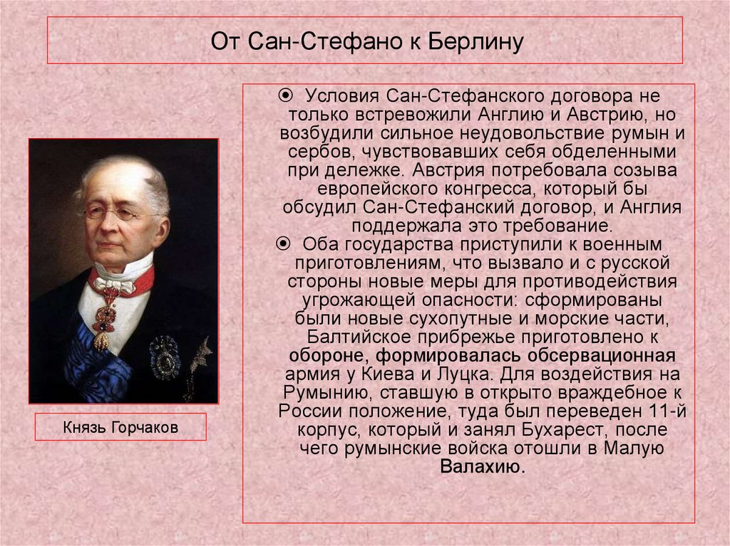 Князь ГорчаковУсловия Сан-Стефанского договора не