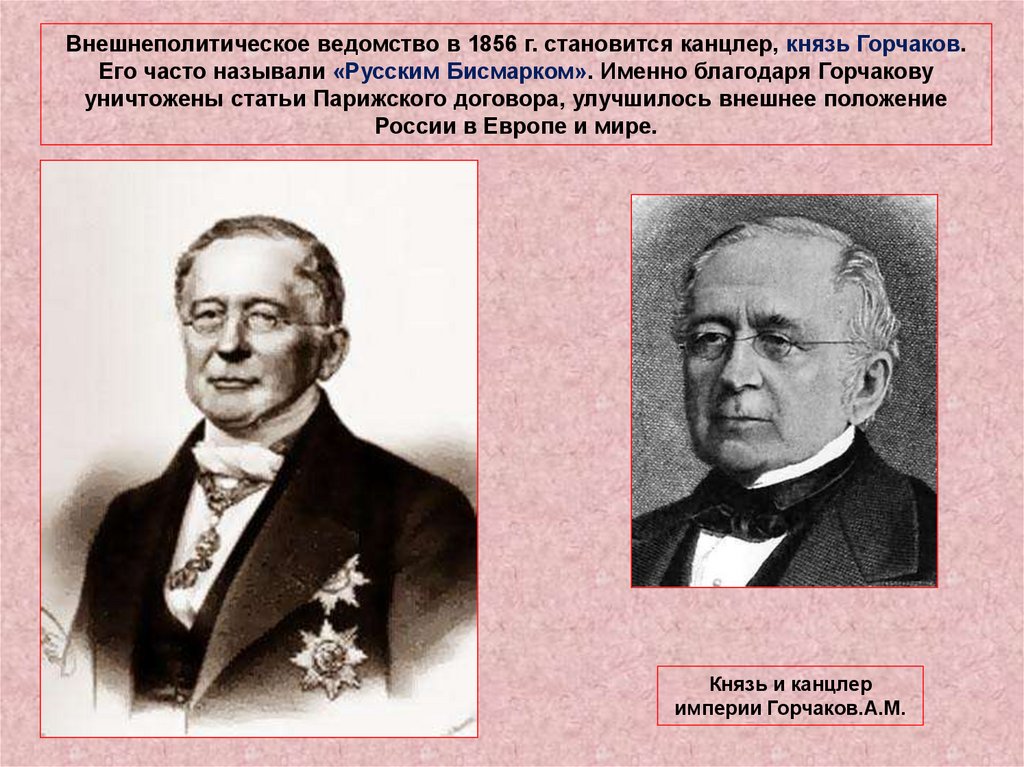 Внешнеполитическое ведомство в 1856 г. становится канцлер, князь Горчаков.Его часто называли «Русским Бисмарком». Именно благодаря Горчакову