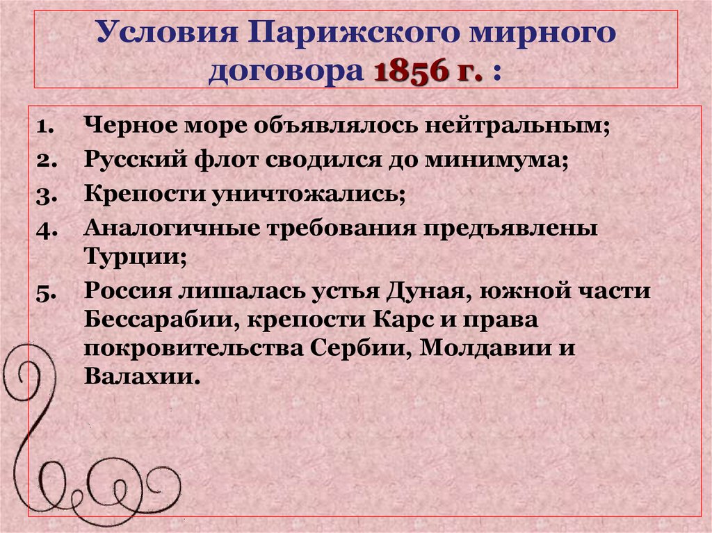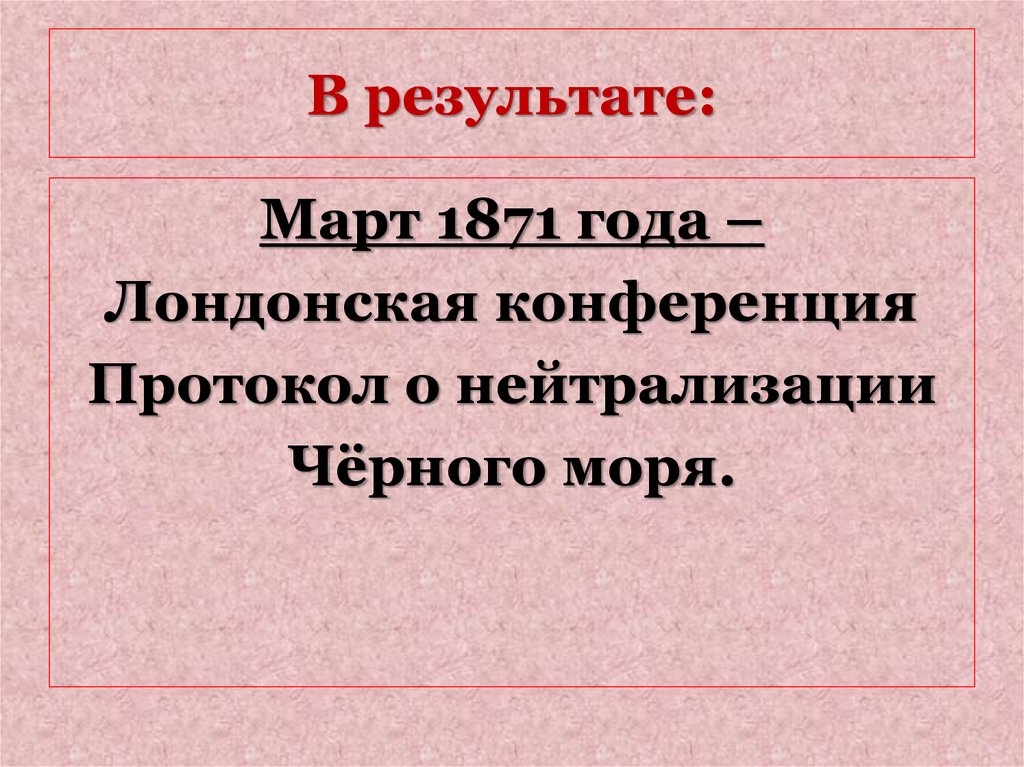 уничтожены статьи Парижского договора, улучшилось внешнее положение