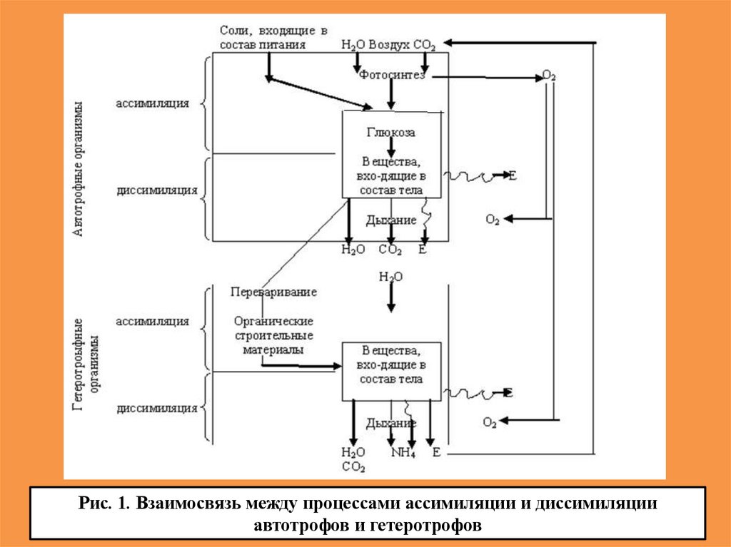 Рис. 1. Взаимосвязь между процессами ассимиляции и диссимиляцииавтотрофов и гетеротрофов