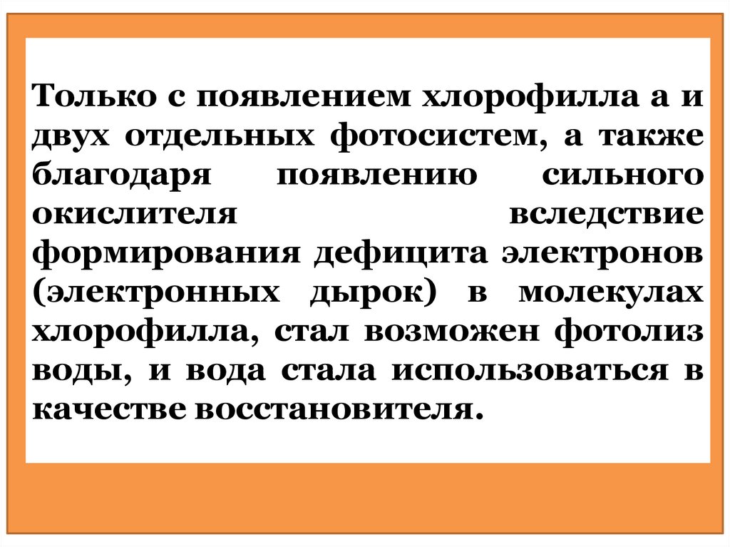 Только с появлением хлорофилла а идвух отдельных фотосистем, а также