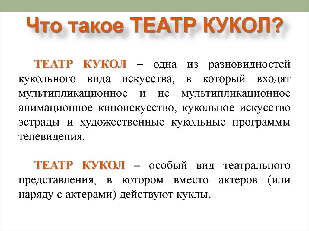 Что такое ТЕАТР КУКОЛ?ТЕАТР КУКОЛ – одна из разновидностей
