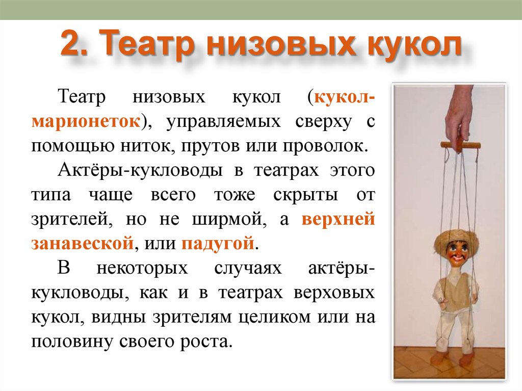 2. Театр низовых куколТеатр низовых кукол (куколмарионеток), управляемых сверху с