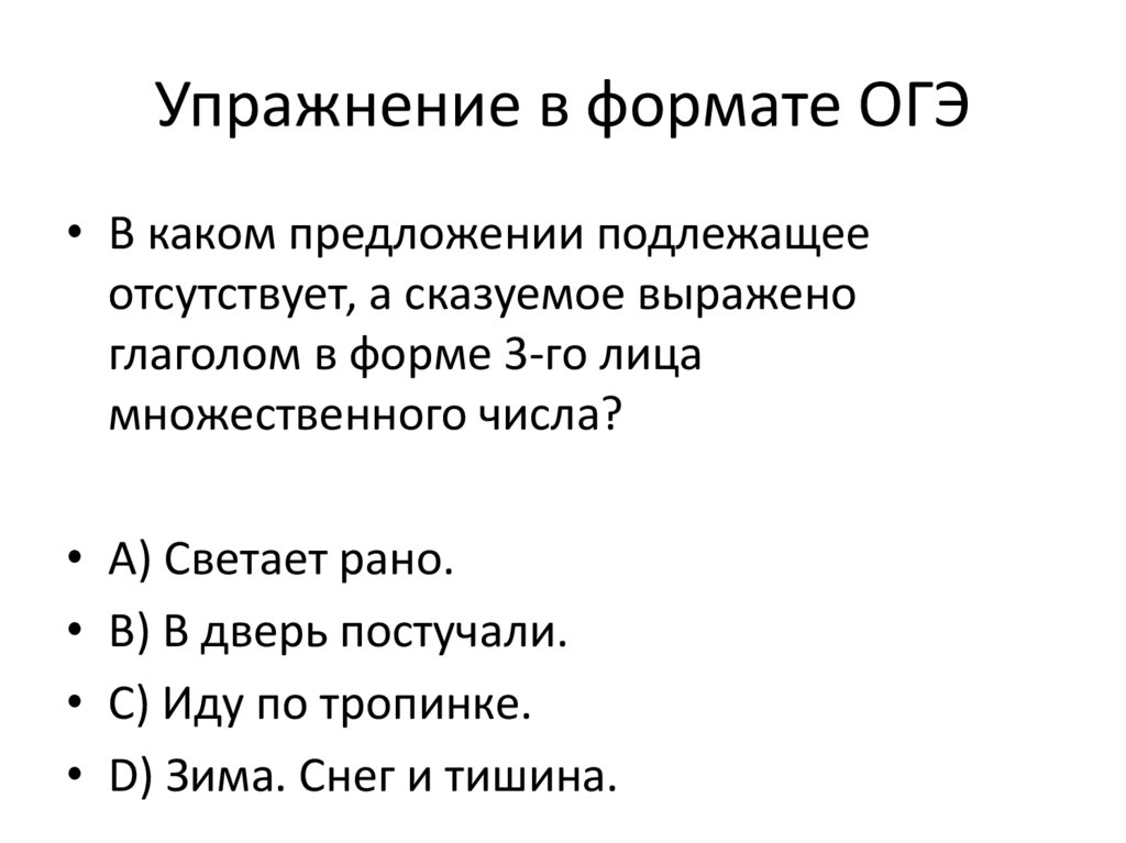 Упражнение в формате ОГЭ• В каком предложении подлежащее