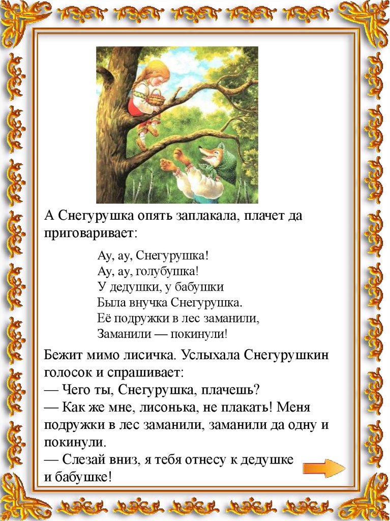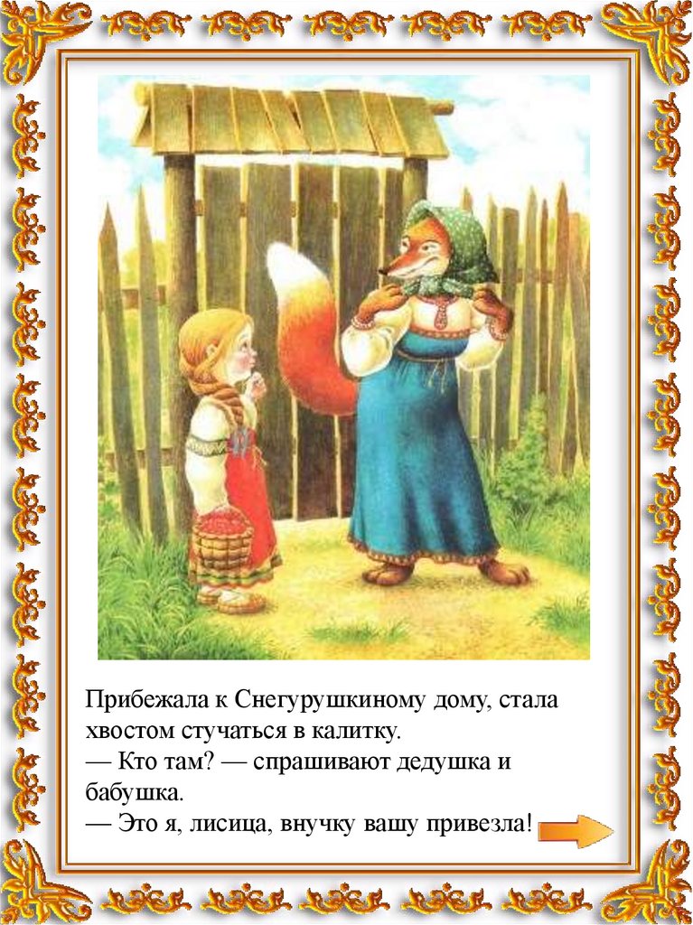 Бежит мимо лисичка. Услыхала Снегурушкин