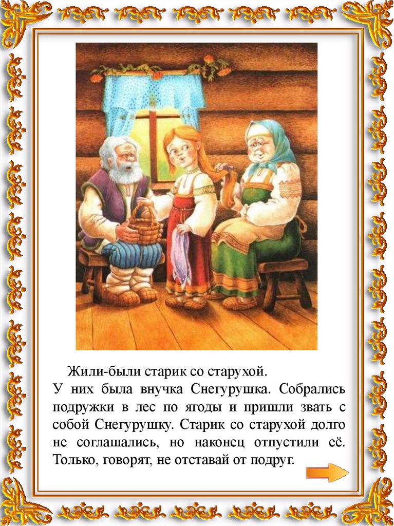 Жили-были старик со старухой.У них была внучка Снегурушка. Собрались