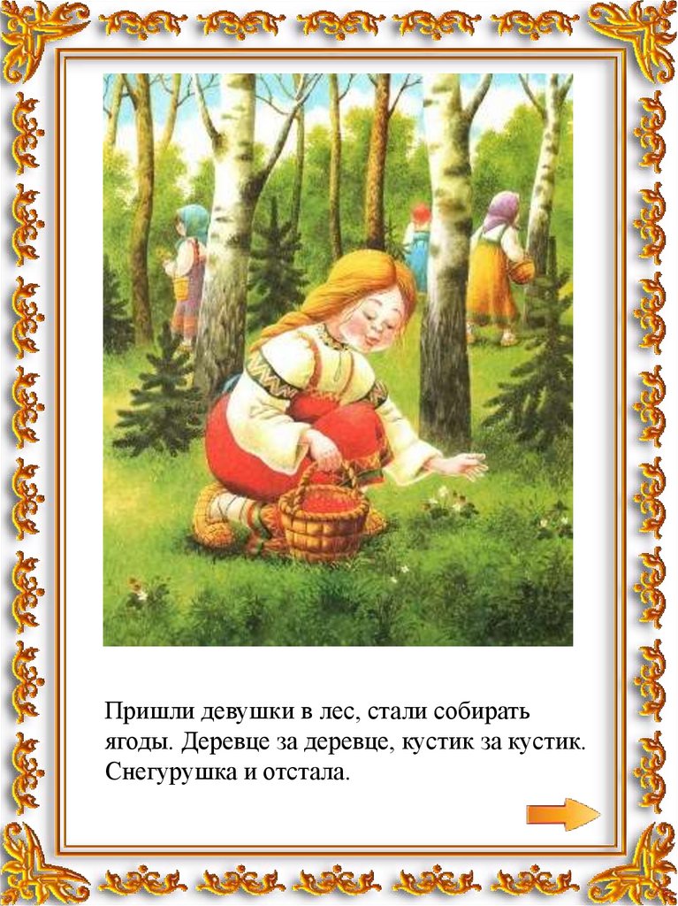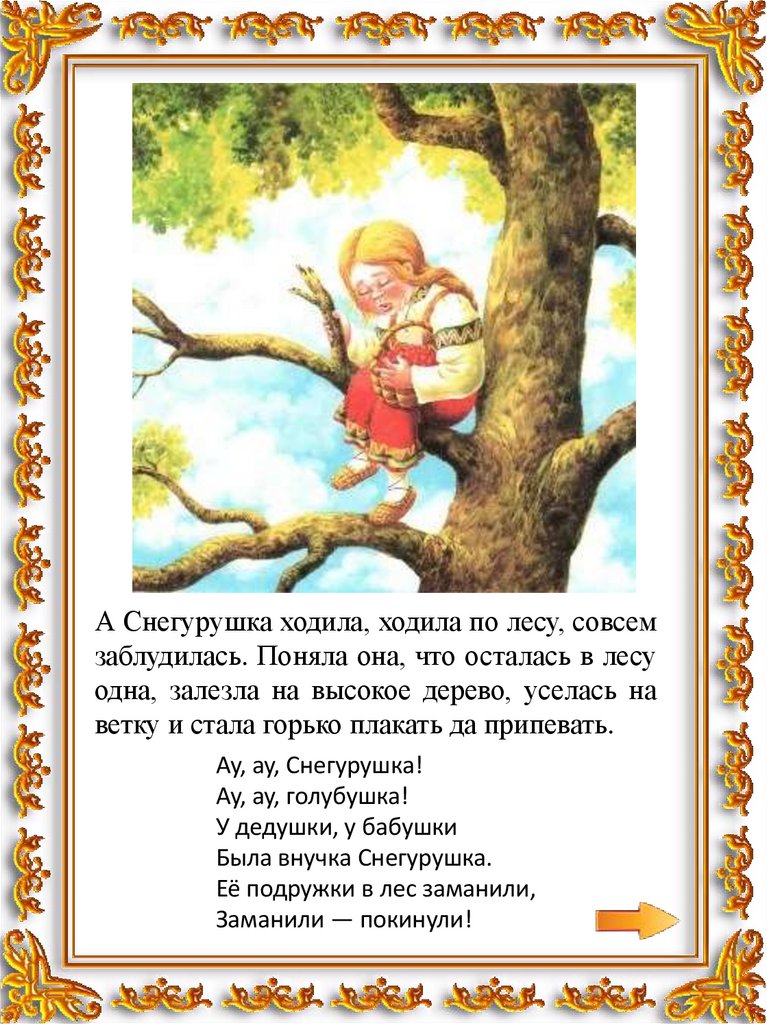 А Снегурушка ходила, ходила по лесу, совсемзаблудилась. Поняла она, что осталась в лесу