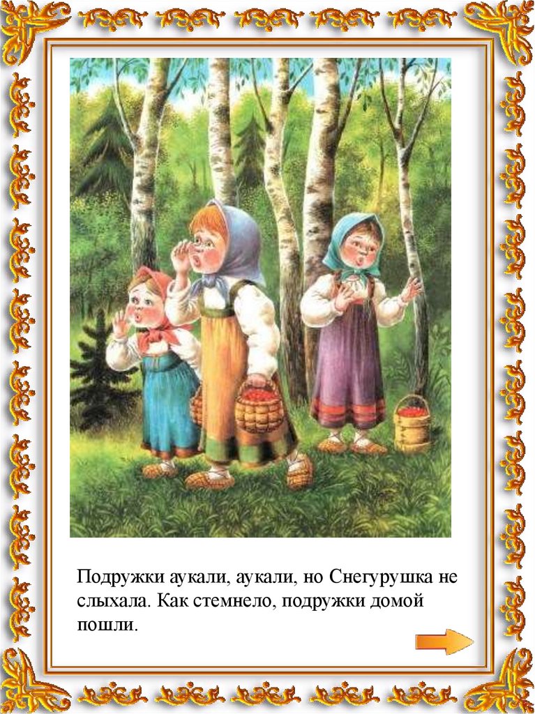 Подружки аукали, аукали, но Снегурушка неслыхала. Как стемнело, подружки домой