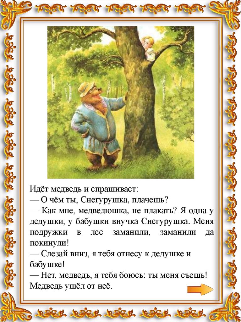 Идёт медведь и спрашивает:— О чём ты, Снегурушка, плачешь?