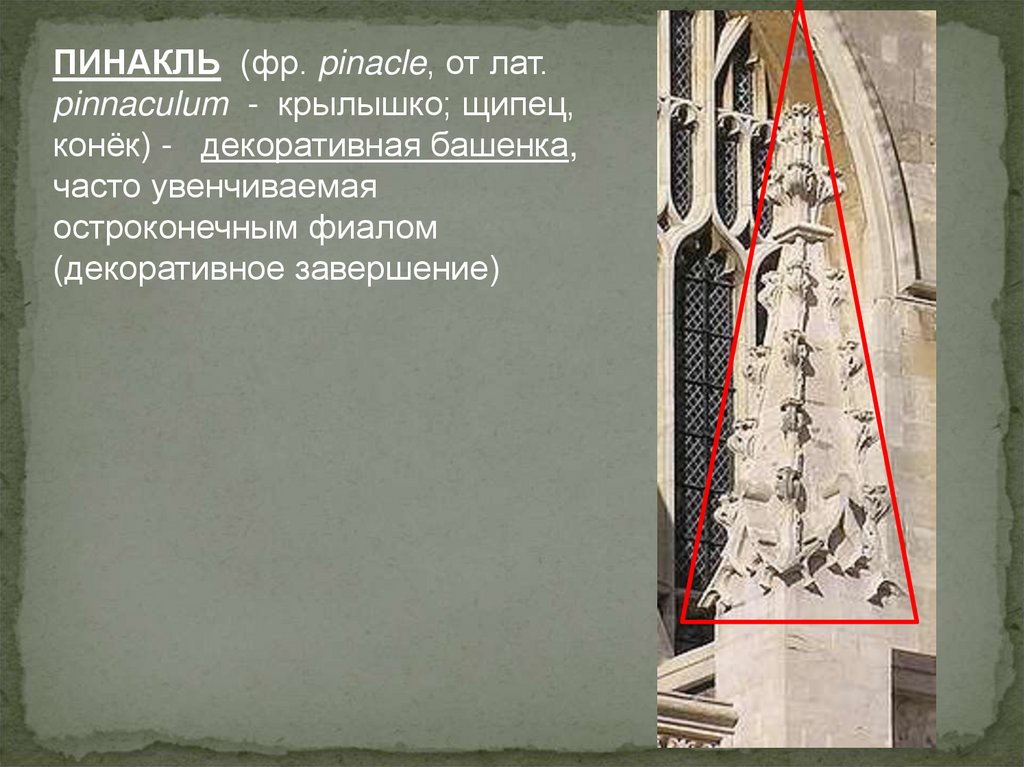 ПИНАКЛЬ (фр. pinacle, от лат.pinnaculum - крылышко; щипец,