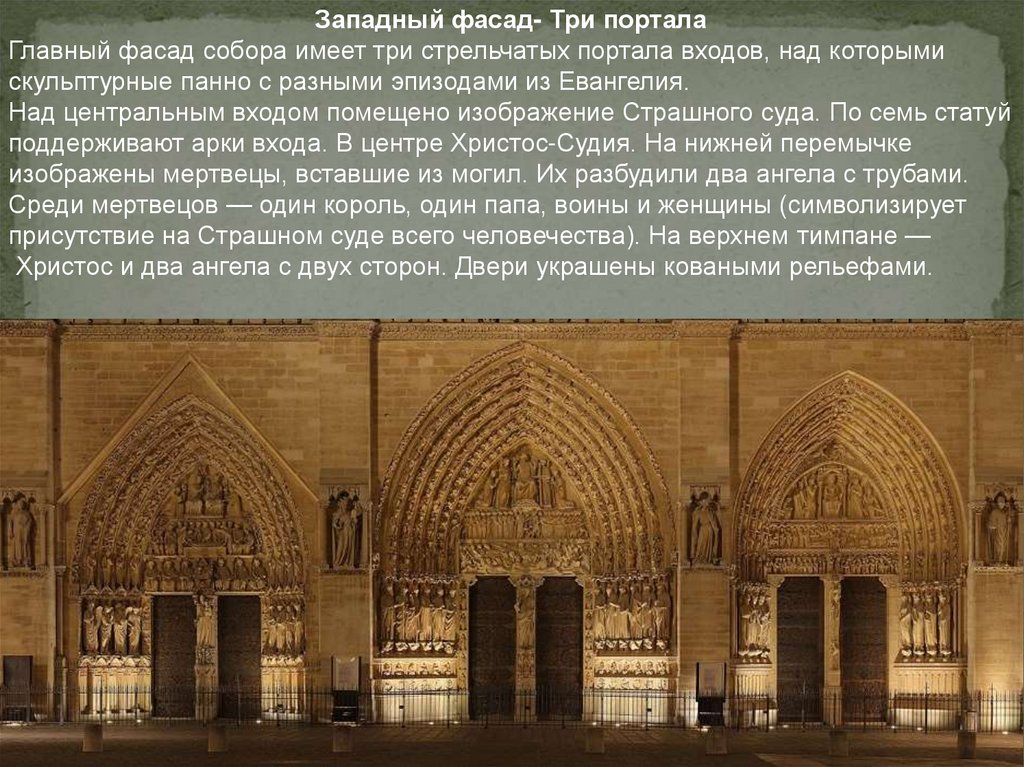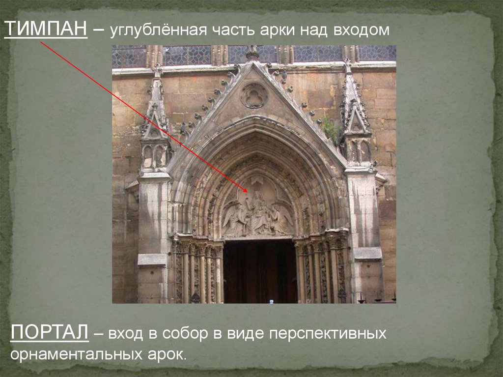 узкие и высокие башни и колонны, порталы (вход), тонкие