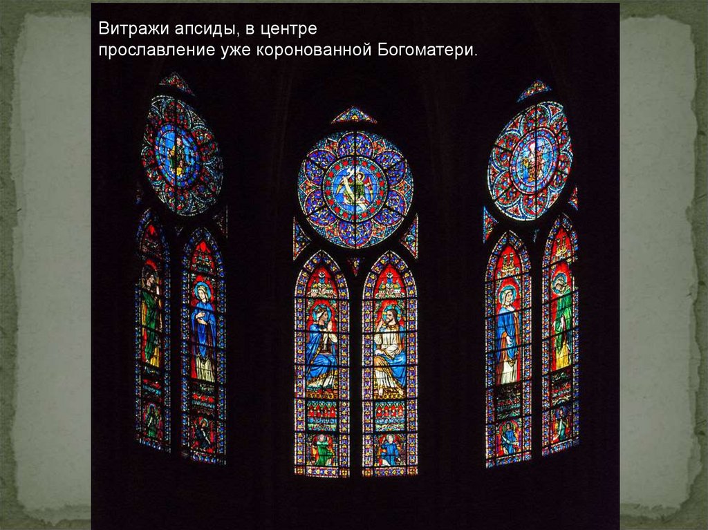 Витражи апсиды, в центрепрославление уже коронованной Богоматери.
