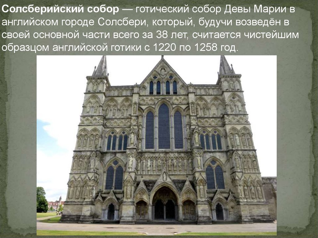Солсберийский собор — готический собор Девы Марии ванглийском городе Солсбери, который, будучи возведён в
