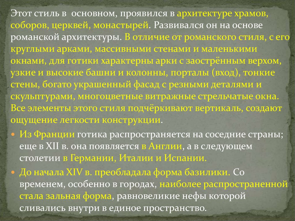 Этот стиль в основном, проявился в архитектуре храмов,соборов, церквей, монастырей. Развивался он на основе