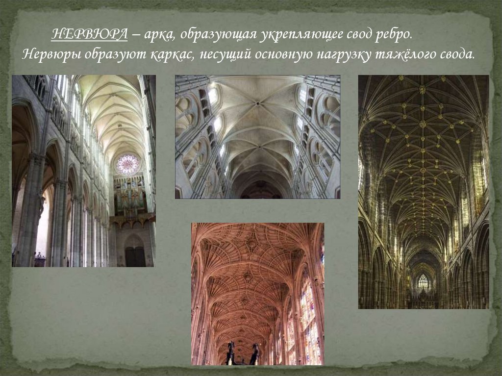 НЕРВЮРА – арка, образующая укрепляющее свод ребро.Нервюры образуют каркас, несущий основную нагрузку тяжёлого свода.