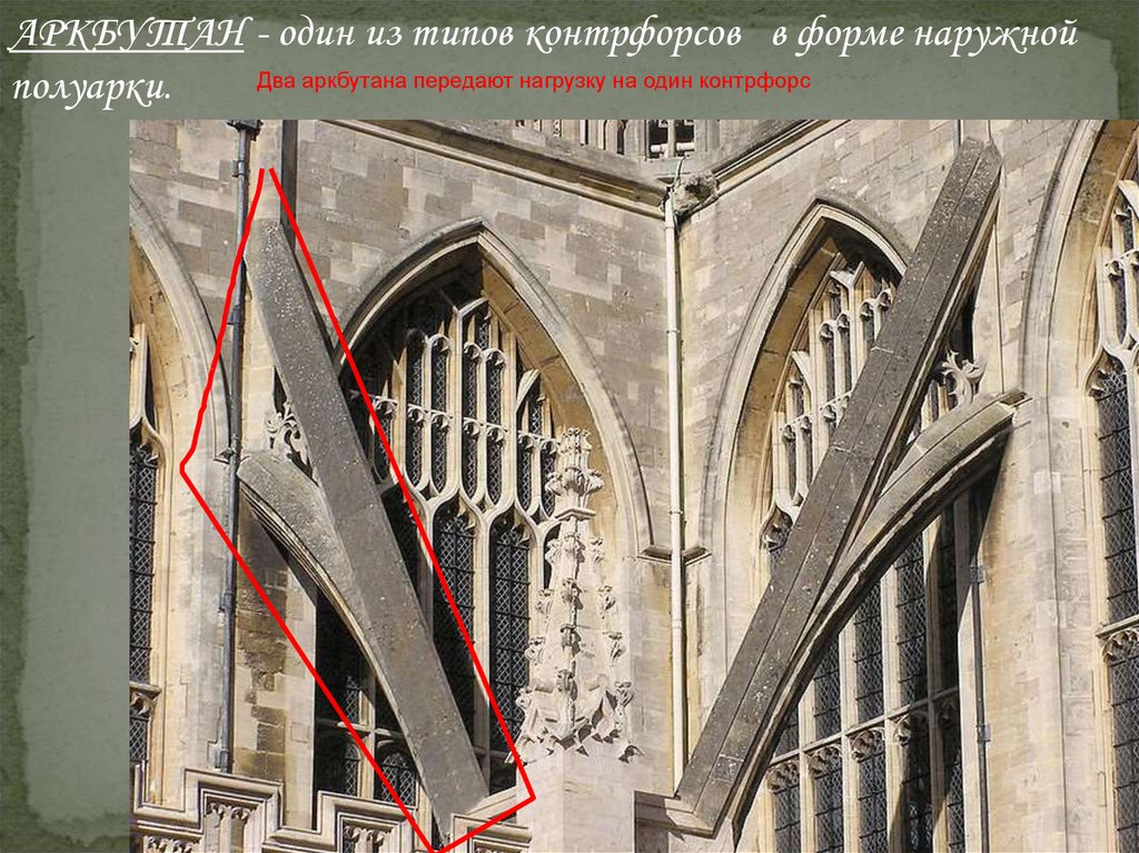 АРКБУТАН - один из типов контрфорсов в форме наружнойДва аркбутана передают нагрузку на один контрфорс