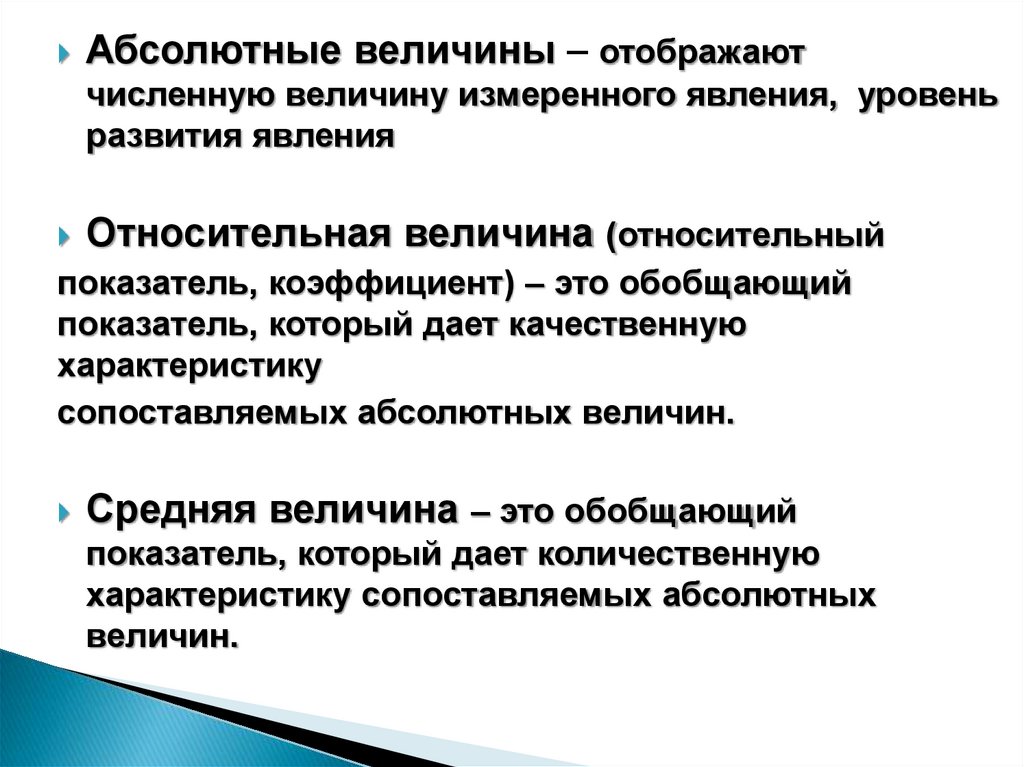 Абсолютные величины – отображаютчисленную величину измеренного явления, уровень