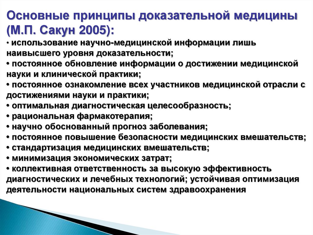 Основные принципы доказательной медицины(М.П. Сакун 2005):