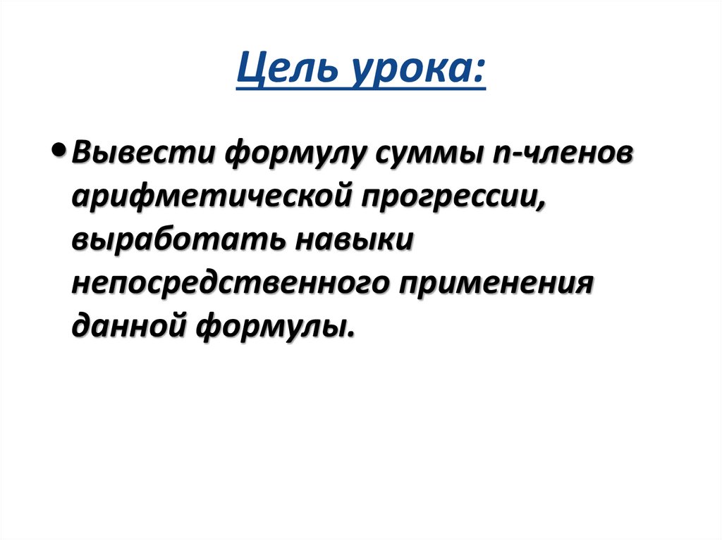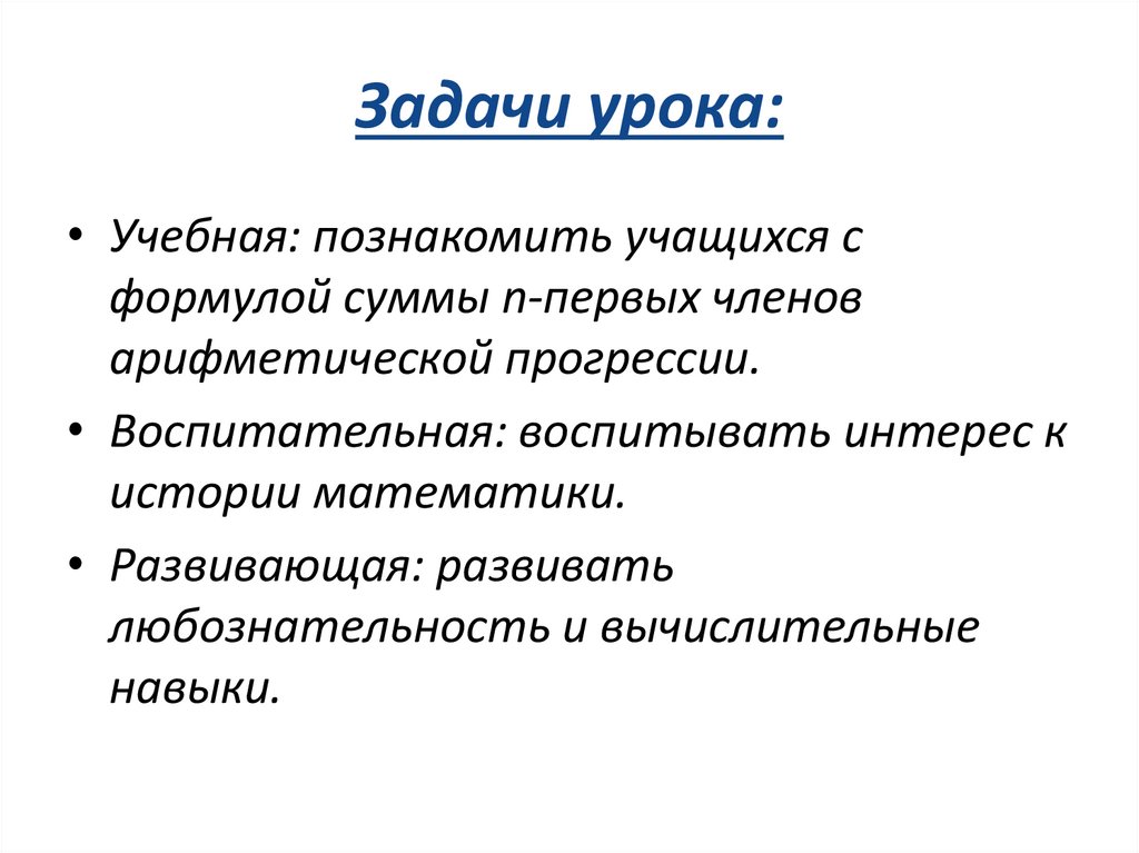 • Учебная: познакомить учащихся сформулой суммы n-первых членов