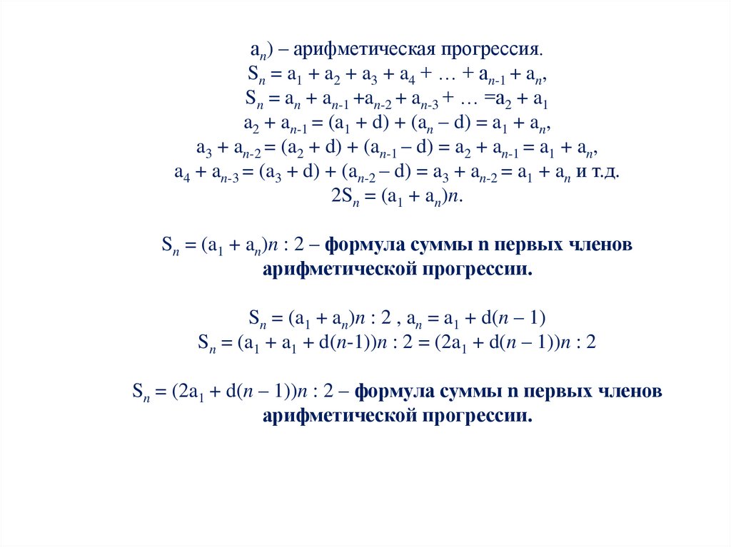 Вывести формулу суммы n-членоварифметической прогрессии,