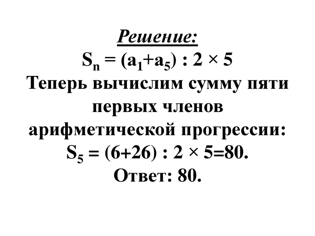 14. Решение: Sn = (а1+а5) : 2 × 5 Теперь вычислим сумму пяти первых членов арифметической прогрессии: S5 = (6+26) : 2 × 5=80.
