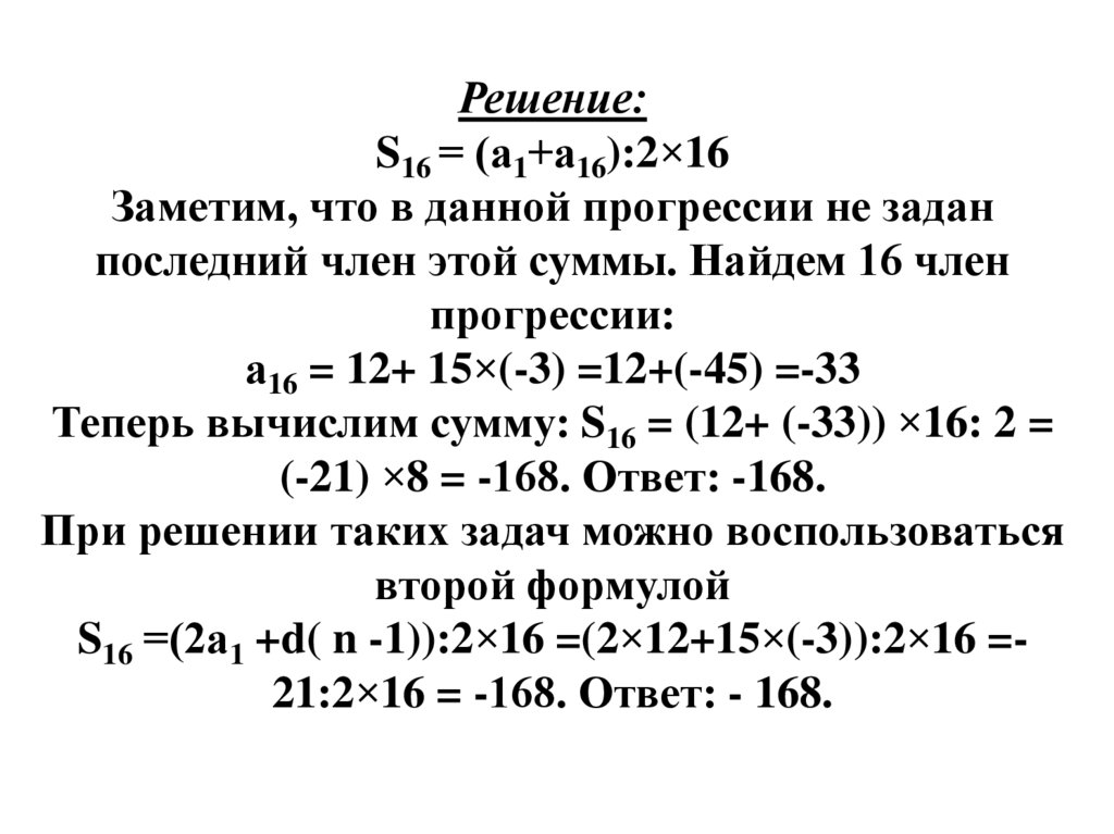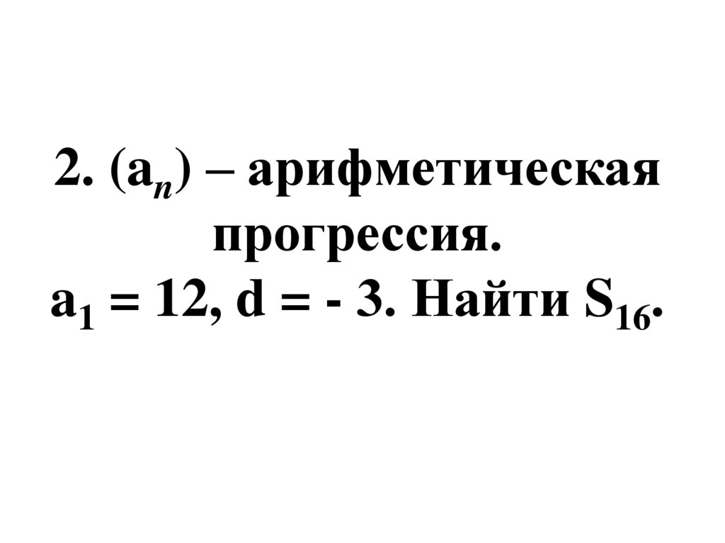 Ответ: 80.15. 2. (an) – арифметическая прогрессия. a1 = 12, d = - 3. Найти S16.