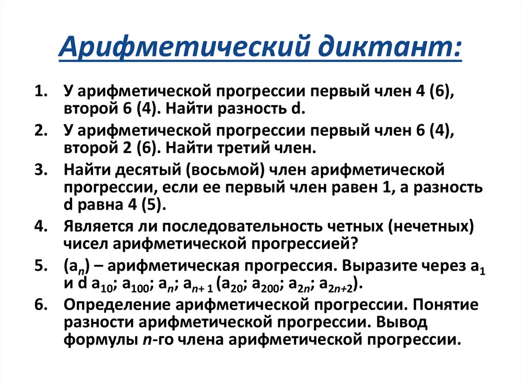 1. У арифметической прогрессии первый член 4 (6),второй 6 (4). Найти разность d.