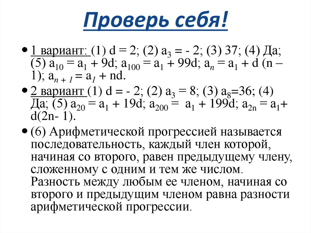 1 вариант: (1) d = 2; (2) а3 = - 2; (3) 37; (4) Да;(5) а10 = а1 + 9d; а100 = а1 + 99d; аn = а1 + d (n –