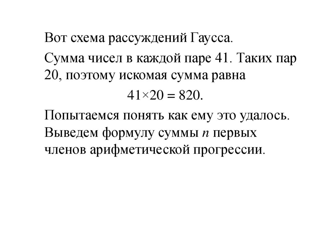 Вот схема рассуждений Гаусса.Сумма чисел в каждой паре 41. Таких пар