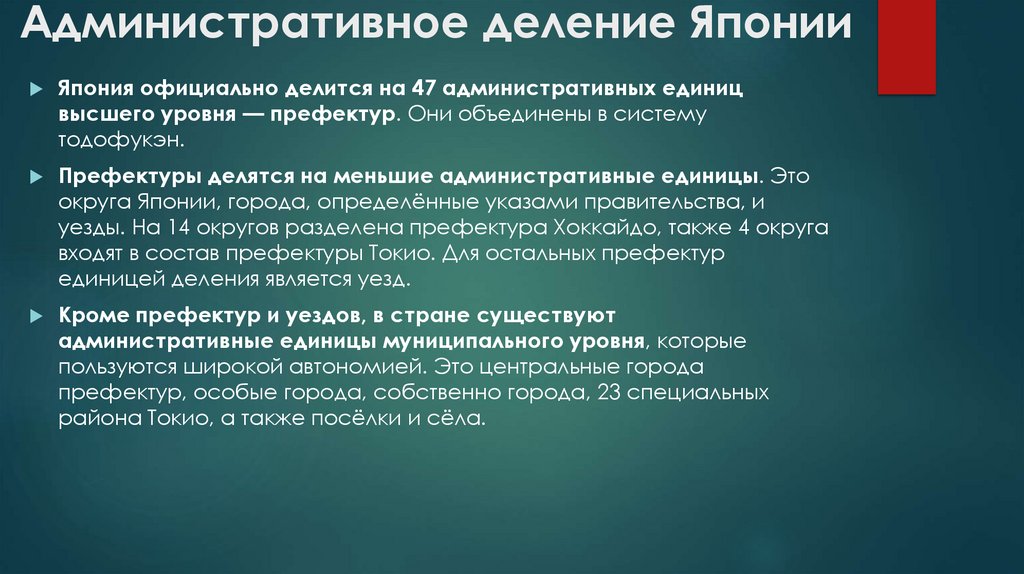 Административное деление ЯпонииЯпония официально делится на 47 административных единиц