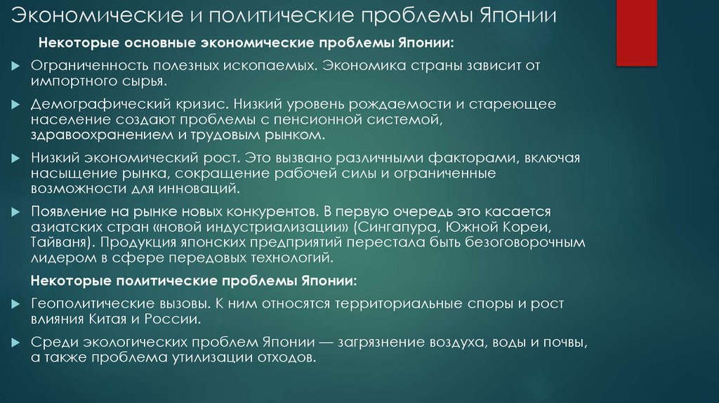 Экономические и политические проблемы ЯпонииНекоторые основные экономические проблемы Японии: