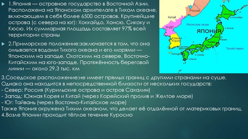 1.Япония — островное государство в Восточной Азии.Расположена на Японском архипелаге в Тихом океане,