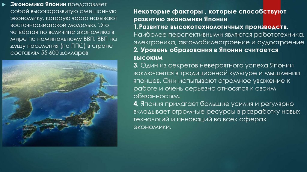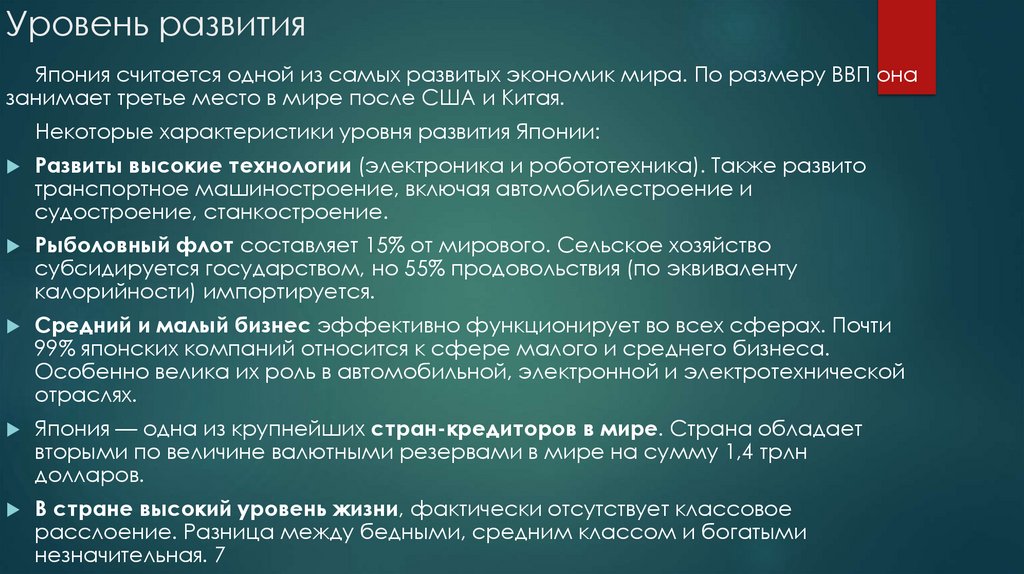 Уровень развитияЯпония считается одной из самых развитых экономик мира. По размеру ВВП она